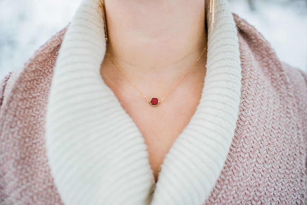 Deep red cushion-shaped druzy in 'Ember' is bezel wrapped and paired with your choice of chain to create a layering necklace. Wear it on its own or with other pieces from your collection.